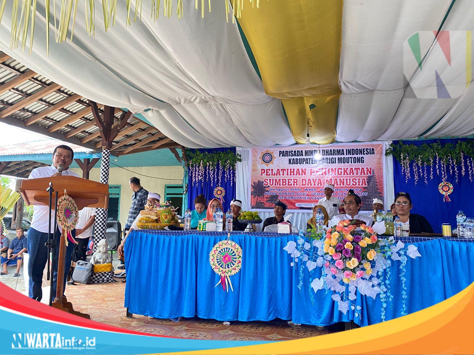 PARIGI MOUTONG, WARTAINFO.ID — Sebuah langkah strategis diambil Parisada Hindu Dharma Indonesia (PHDI) Kabupaten Parigi Moutong untuk meningkatkan kualitas pelayanan keagamaan di tingkat akar rumput. Bekerja sama dengan Pembimas Hindu Provinsi Sulawesi Tengah dan Penyelenggara Hindu Kabupaten Parigi Moutong, PHDI menggelar pelatihan peningkatan Sumber Daya Manusia (SDM) bagi para Jro, Mangku, dan Srati, Sabtu (6/7/2024), di Kecamatan Mepanga.