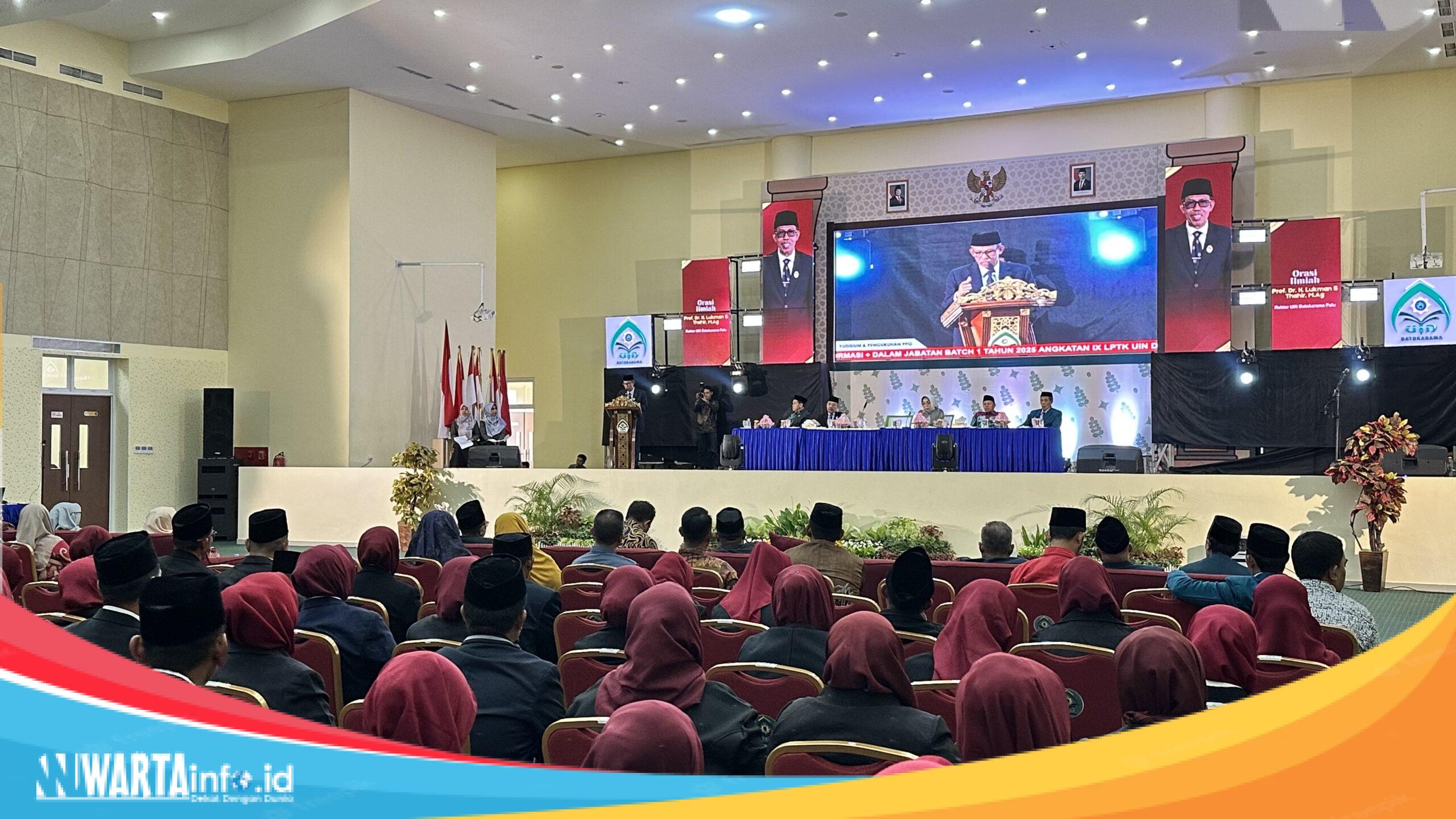 PALU, WARTAINFO.ID – Suasana khidmat dan penuh haru menyelimuti Auditorium Universitas Islam Negeri (UIN) Datokarama Palu, saat ratusan guru madrasah dari berbagai daerah di Indonesia resmi dikukuhkan sebagai guru profesional melalui acara Yudisium dan Pengukuhan Guru Profesional Pendidikan Profesi Guru (PPG) Transformasi Dalam Jabatan Batch I Tahun 2025 Angkatan IX. Acara yang digelar pada Minggu (28/9/2025) ini menjadi momen penting dalam upaya pemerintah mewujudkan guru berkualitas yang mampu menghadapi tantangan pendidikan abad ke-21.