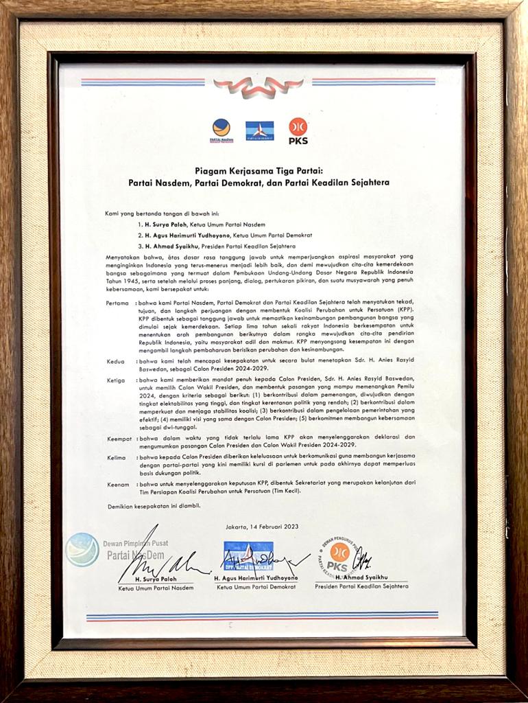 “Kerja-kerja senyap dan intensif dari Tim Kecil terus dilakukan hingga akhirnya membuahkan hasil berupa dukungan resmi seluruh Partai. Sejak hari ini, Jumat Wage 24 Maret 2023 Tim Kecil bersiap melaksanakan tugas baru dari Capres Anies untuk melanjutkan proses berikutnya. Yakni, persiapan proses untuk penetapan calon wakil presiden dari Koalisi Perubahan,” tutur Sugeng Suparwoto, salah satu Ketua Partai Nasdem, anggota Tim 8. Sugeng menutup dengan menjelaskan bahwa koalisi ini membuka luas ruang bagi partai-partai lain untuk bergabung. “Salah satu butir kesepakatan koalisi mencerminkan spirit kolaborasi dengan kekuatan politik lainnya. Kami terus dan tetap membuka luas ruang koalisi dengan partai-partai lain yang memiliki visi yang sama,” tegas Sugeng Suparwoto. (*)